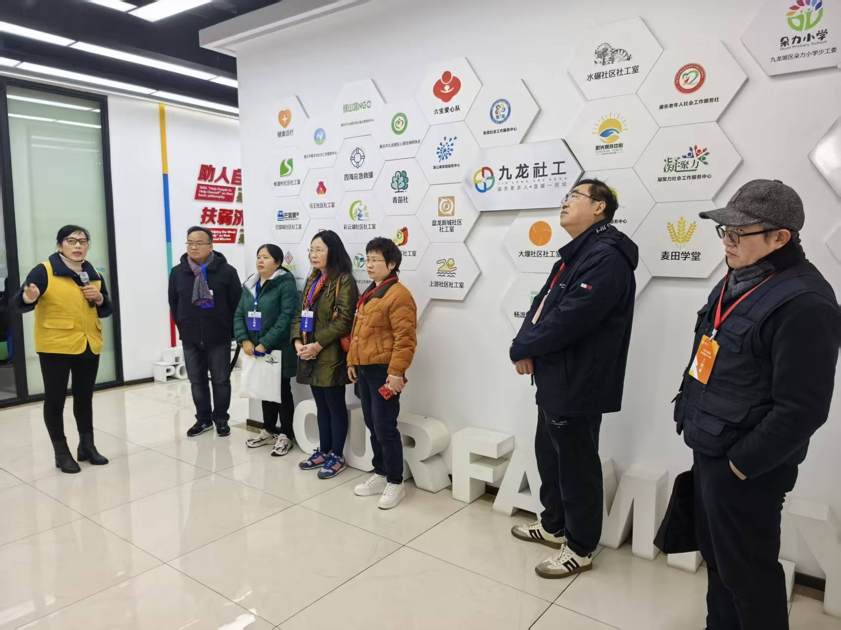 首先,调研人员在九龙坡区九龙社会工作服务中心党支部书记、主任陈会兰的带领下参观了中心的工作环境。陈会兰书记向众人介绍了中心发展情况、基地建设情况、基地规模、项目申报及实施工作、基地帮扶模式以及服务保障内容等,以视频的形式展现了基地的工作方式及内容。中心于2019年4月建成,目前已培育社会工作人才372人、社区社会组织295个、注册志愿者4万余名,实施市、区、街道购买项目599个,投入项目资金985万元,开展公益服务活动5000余场次。2021年,与西南大学签约,成为专业学位研究生联合培养基地。