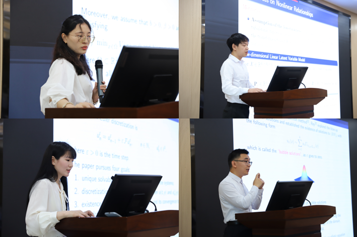 汇报环节中,10位博士、硕士研究生依次登台。同学们首先向母校120周年校庆、学院办学85周年送上诚挚祝福,随后围绕各自的研究成果展开学术陈述。本次汇报研究方向覆盖基础数学、应用数学、统计学等多个前沿领域,既包含三维磁流体动力学方程、偏微分方程解的性质等基础理论研究,也涵盖张量补全、谱CT重建等统计学应用创新,以及生态数学模型等交叉方向探索。汇报过程中,同学们展现了扎实的学术功底与创新思维,台下评委提问深刻、研讨深入,现场学术氛围浓厚,充分彰显了学院优良的学术传承与科研风貌。